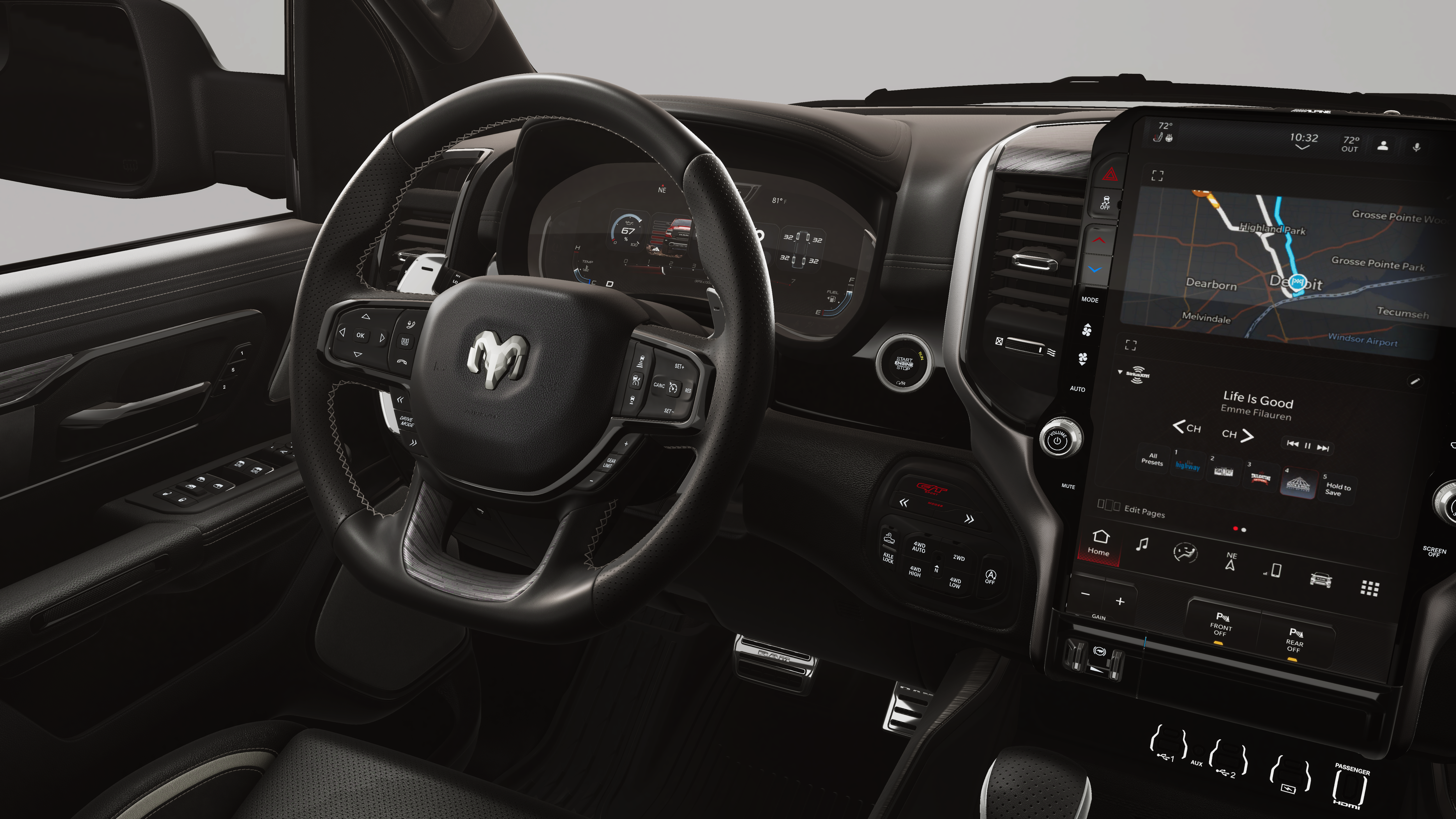 This 1/2 ton pickup has automated speed control that adjusts to maintain a safe following distance, enhancing highway driving convenience. Enjoy your music even more with the premium sound system in this model. This vehicle's Forward Collision Warning feature alerts drivers to potential front-end collisions. The leather seats in the vehicle are a must for buyers looking for comfort, durability, and style. See what's behind you with the back up camera on it. Apple CarPlay: Seamless smartphone integration for this vehicle - stay connected and entertained on the go! This 1/2 ton pickup is equipped with the latest generation of XM/Sirius Radio. An off-road package is equipped on it. Keep your hands warm all winter with a heated steering wheel in this model . This 2026 Ram 1500 comes equipped with Android Auto for seamless smartphone integration on the road. It features a hands-free Bluetooth® phone system. You'll never again be lost in a crowded city or a country region with the navigation system on this unit.